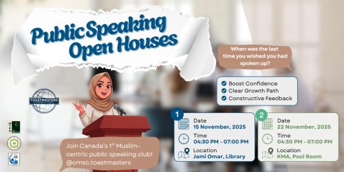 Join us for an inspiring and interactive Open House to find out about the Ottawa Muslim Speakers Club, where public speaking meets community connection!